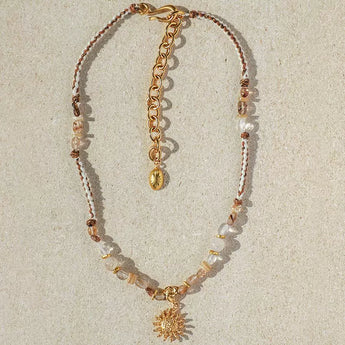 - Gold: Rutilated Quartz, Rock Crystal, Mother of Pearl, 18K gold vermeil sterling silver, cotton rope